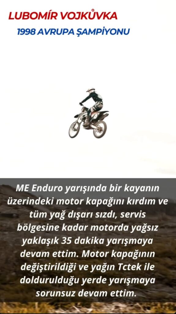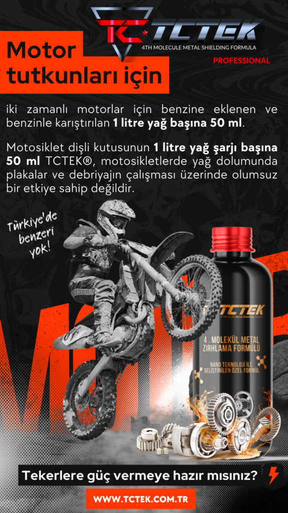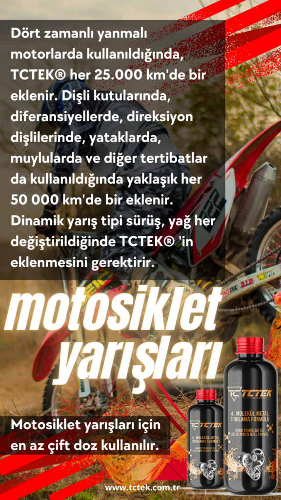 Motosikletlerde bulunan zincirlerde ve bütün metal parçaların kullanım kolaylığı ile birlikte ömrünü uzatarak yüksek performanslı çalışmasını sağlar. Belirtilen miktarlarda litre başına Yağ deposuna, Yakıt deposuna eklenildiğinde oluşabilecek arızaları tedavi eder Buda yakıt tasarrufu ile birlikte Servis ve parça değişimini olabildiğince ertelemektedir. Özellikle antrenman motosikletleri için en çok tercih edilen TCTEK motosiklet üstünde kullanılan ürünlerin ömrünü uzattığı için bu aksamlar ile antrenman sürelerini uzatabilirsiniz. Buda size vakit ve nakit olarak çok fazla tasarruf sağlamakta. Motorunuz üzerinde çok uzun süre kalabilirsiniz.